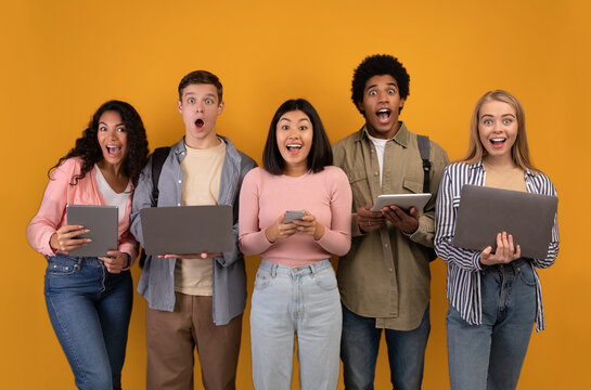 Group of kids using laptops, smiling and learning together. Diverse children engaged with technology, enjoying teamwork and education. Happy kids learning with a laptop, online education for students.