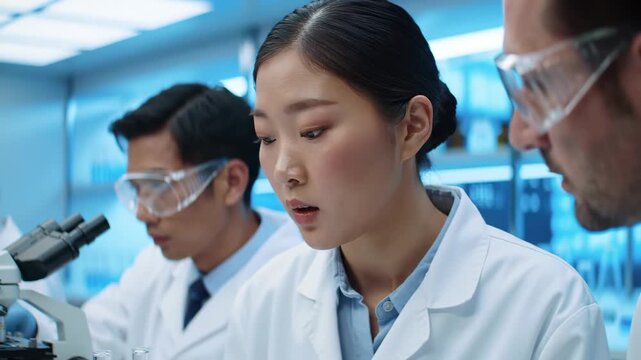 Scientists collaborating in clean laboratory while examining nanotechnology devices through advanced microscope, symbolizing teamwork, futuristic discoveries, and groundbreaking research progress.