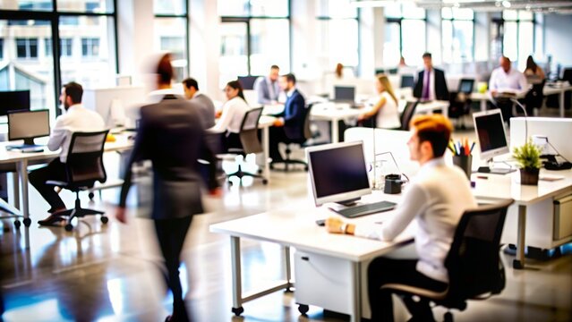 Office Workspace Blur - A collaborative workspace with employees and desks, blurred.