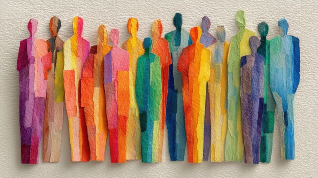 A collection of brightly colored paper cutouts depicting diverse human figures, representing unity and diversity, set against a soft light backdrop. The figures showcase various colors and shapes