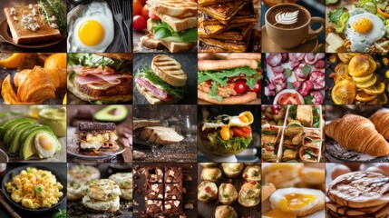 This image features a vibrant collage of various breakfast and snack foods, including pancakes, sandwiches, pastries, coffee, and fresh produce. Each section showcases a different culinary delight, of