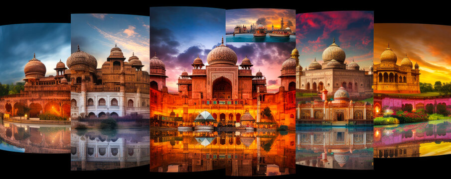 Stunning collage showcasing India's architectural, landscape, and cultural diversity with vibrant colors and dynamic overlays; a mesmerizing visual journey. Generative AI