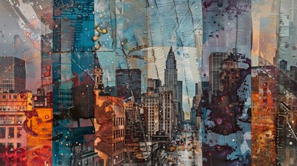 A mixed media collage showcasing different textures and colors combining photographs of city windows with layers of crinkled tissue paper designed to look like raindrops.