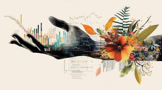 Modern collage hand depicts an investment concept, illustrating marketing and trading. This online stock banner showcases financial elements and graphs, promoting investment opportunities