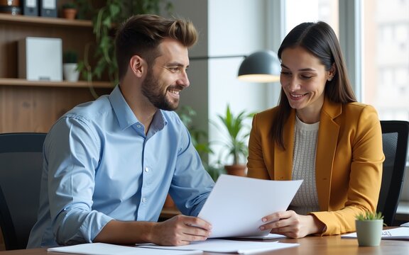 Human resource manager going through documents with male candidate in office. High quality
