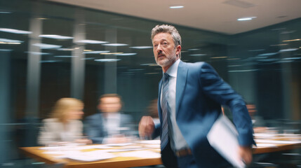 Determined mature businessman running fast, leaving corporate office meeting. motion blur in modern boardroom conveys sense of urgency, pressure, and speed