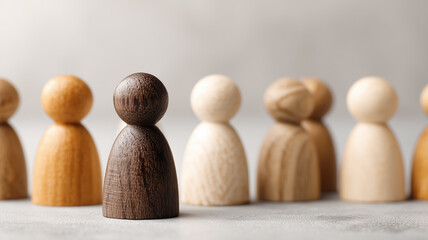 Diverse wooden figures aligned together representing inclusion equality and social diversity concept.