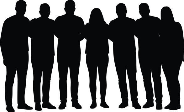 Silhouettes of seven individuals standing in a row, symbolizing unity, teamwork, and collective identity in a minimalist composition