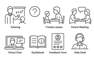 Educational services icons: tutoring, private lessons, parent meetings, virtual chat, guidebook, feedback, help desk