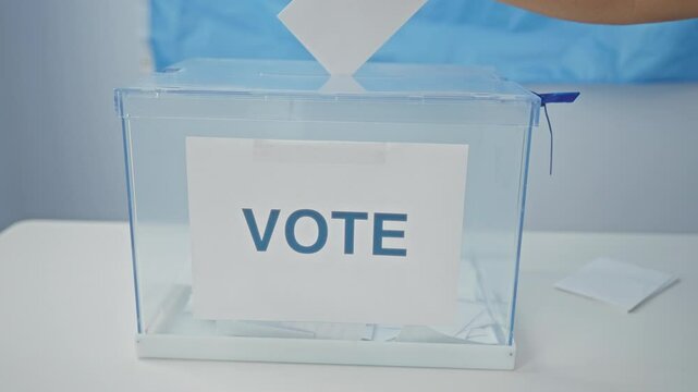 A young hispanic man casts his vote in an electoral college room, depicted in an indoor setting with bright windows, wearing a green medical uniform and a stethoscope around his neck.