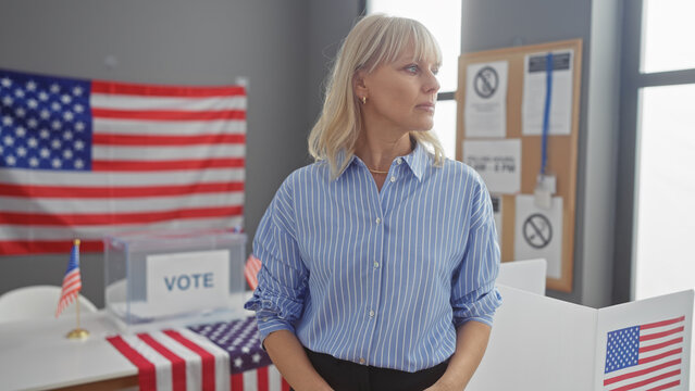 Smiling african american woman standing in a brazilian electoral room with voting booths and ballot box.