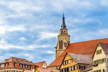 Medieval late gothic St. George's Collegiate Church (Stiftskirche) city skyline in the old town of Tübingen, Baden-Württemberg, Germany