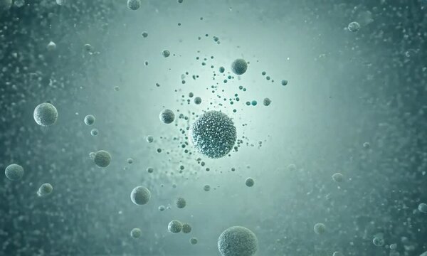 Zoom shot with particle dynamics in a colloid: The camera starts with a view of micro-particles in a colloidal suspension. The camera zooms in to show the dynamic behavior of the particles, including