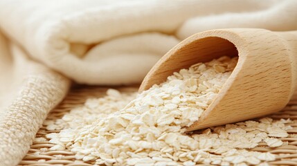 A delicate wooden scoop pouring colloidal oatmeal into a milk bath.