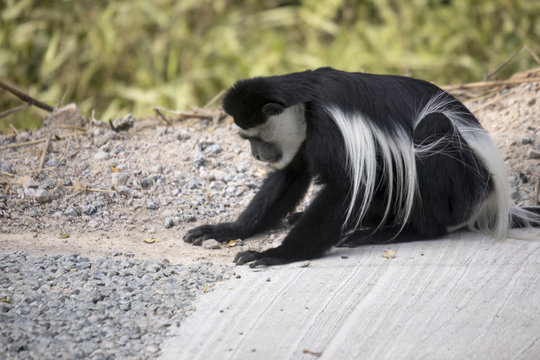 Black and white colobus monkey eating gravel