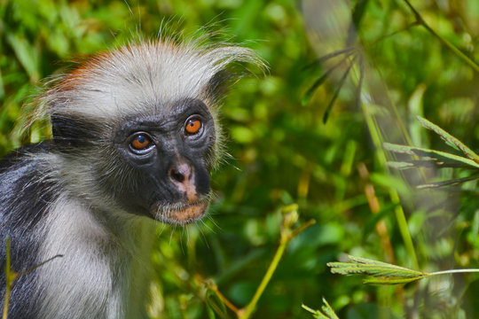 An endangered Zanzibar red colobus monkey (Piliocolobus kirkii), sitting on a tree at Jozani forest, Zanzibar