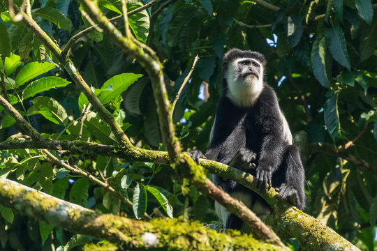 Black-and-white colobuses colobus monkey curious and observing while sitting on a tree