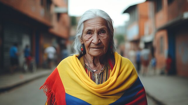 Colombian old woman with colombian flag on him on the street