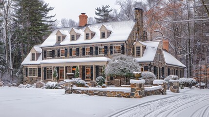 Snow-covered New England colonial home with shingle and stone exterior, peaceful winter landscape in high detail.