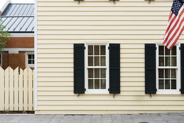 colonial house exterior with painted white trim and black shutters, created with generative ai