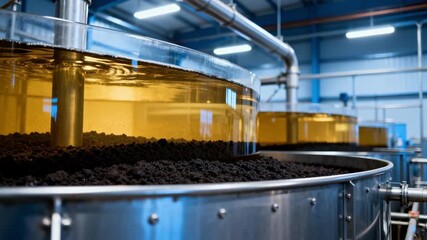 Medium shot of large steel soybean oil settling tanks indoors with bright industrial lighting highlighting clear separation of oil and sediment layers.