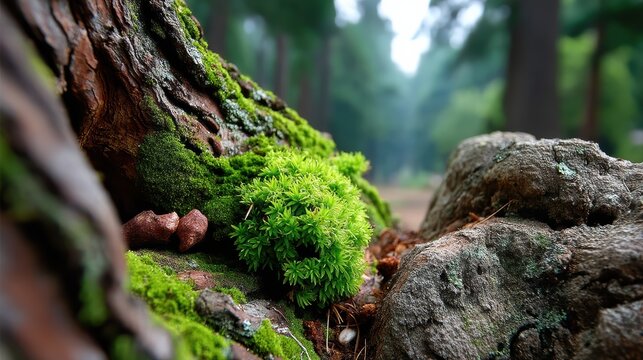 Soft moss has colonized the intricate texture of this tree bark, creating a natural, earthy pattern in close-up detail. In a forest environment, the macro view reveals the organic beauty of nature's