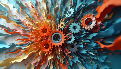Abstract burst of clock gears exploding into multicolor particles, symbolizing breaking free from time constraints