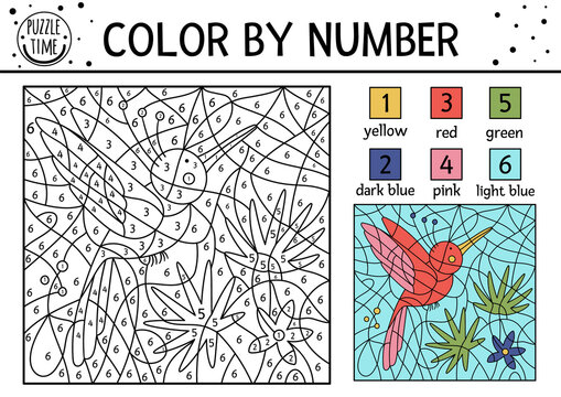 Vector tropical color by number activity with paradise bird, palm tree leaves and flower. Summer coloring and counting game with cute animal. Funny exotic coloration page for kids. .