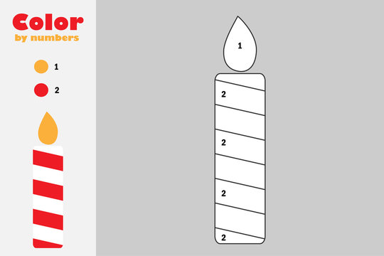 Candle in cartoon style, color by number, christmas education paper game for the development of children, coloring page, kids preschool activity, printable worksheet, vector illustration