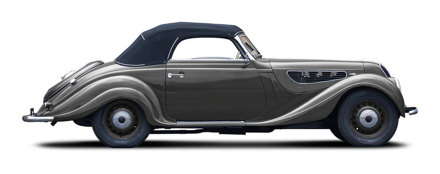 Classic European retro car in gray. With a convertible body and a soft top in black.