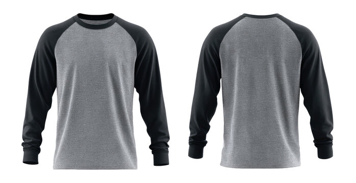 Gray and black raglan sleeve long-sleeved shirt mockup.  Front and back views