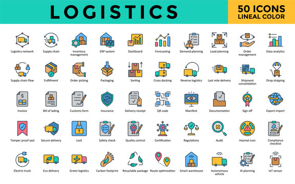Logistics icons set with logistics network, supply chain, inventory management, erp system, dashboard, forecasting, demand planning, load planning, order management icon. Simple lineal color vector