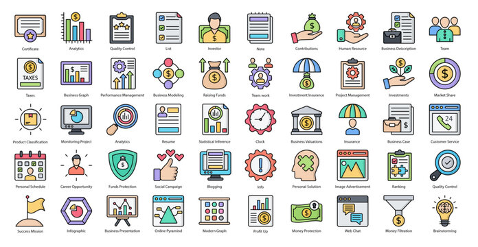 Enterprise, business startup and project communication and SME management color icon set. Digital data and trends, documents and chart report research, meeting flat elements vector illustration