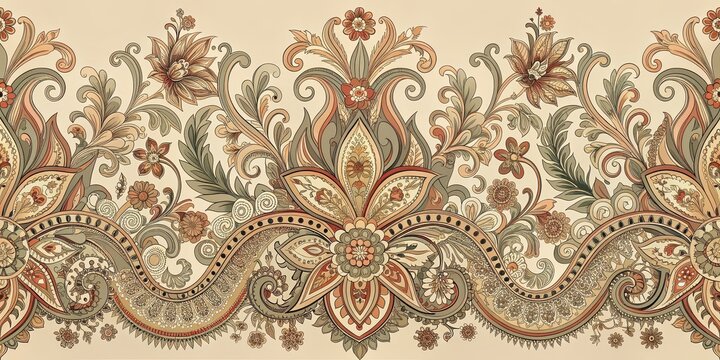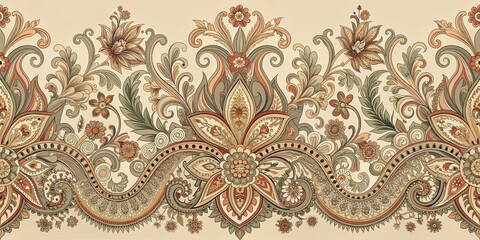 Elegant hand-made baroque ornament and paisley pattern design for textile decor, featuring intricate details in a soft color palette, carpet pattern, digital design, textile motif