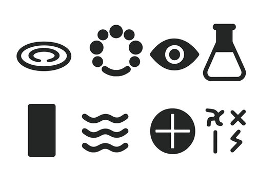 Uroscopy Symbol Icons. Solid style icons of uroscopy symbolism: Liquid Ripple, Circle of Tones, Observation Eye, Flask Shadow,