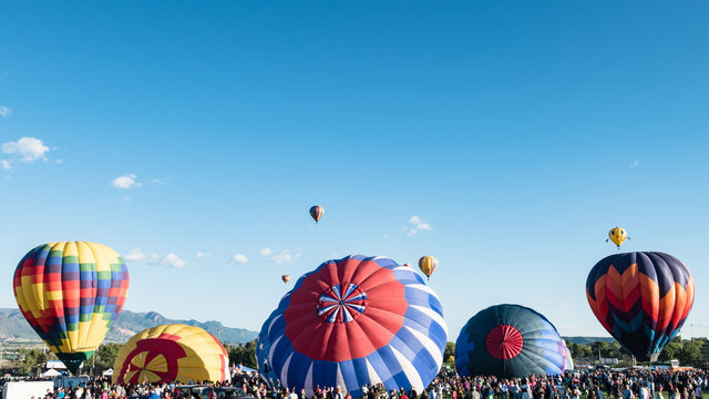 Panoramic landscape view from the Garden of the Gods park looking towards the west and Pikes Peak at the spectacular sunset.