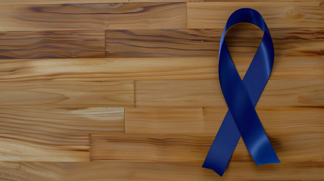 Flat lay blue cancer ribbon timber background  colon prostate diabetes men mental health colorectal support awareness month fundraise charity healthcare courage surviving copy space banner campaign