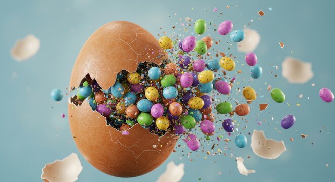 Exploding Easter egg with colorful candy eggs and confetti