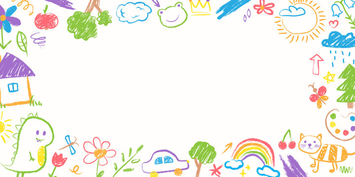 Colorful doodle frame, border with hand drawn crayon children drawings. Chalk texture, cute childish illustrations on white paper background. Creative template for banner, kids certificate of diploma.