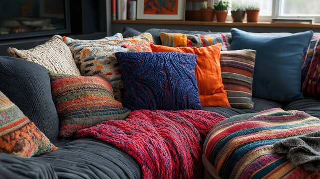 Living room with a gray couch and several colorful throw pillows and blankets scattered on it. the pillows are of different sizes and colors, including orange, blue, green, yellow, and red.