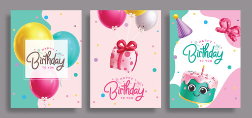 Vibrant set of birthday cards with textured colorful decorations, cupcakes, and party items. Perfect for sending birthday greetings or for use as party invitation designs