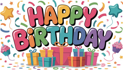 Happy birthday text with colorful gifts, balloons, cupcakes and confetti on a white background design