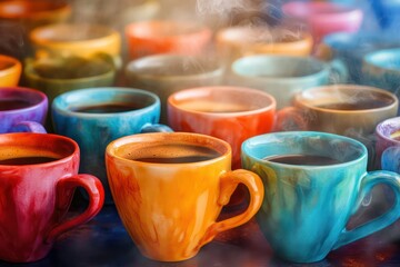 A colorful array of steaming coffee cups with modern shading and subtle textures.