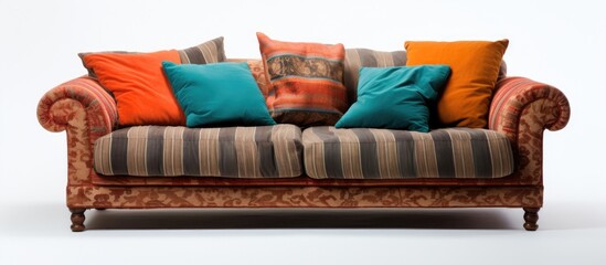 A striped couch is featured with an assortment of colorful pillows placed neatly on top. The couch stands out against an isolated white background.
