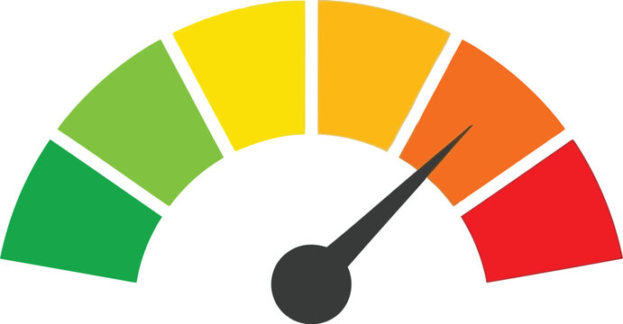 Colorful gauge illustrating cholesterol levels with a needle pointing to a high range in red, emphasizing health awareness.
