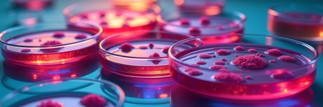 Abstract close-up of petri dishes with vibrant liquid and cells, lab, colorful, abstract