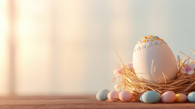 Colorful easter eggs resting in a straw basket with a sparkling spring background