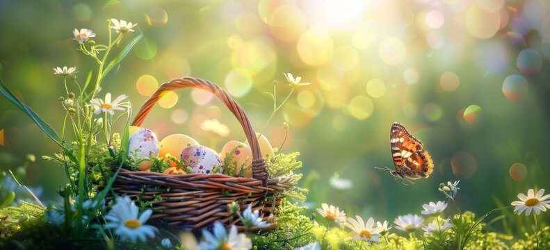 Easter background with colorful eggs in a basket on green grass, flowers and a butterfly Generative AI
