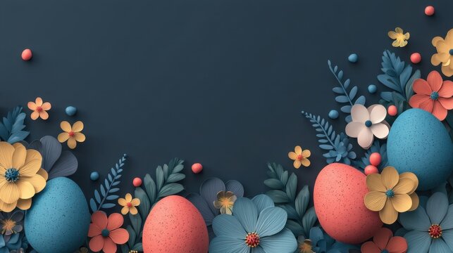 Brightly colored Easter eggs sit among various flowers on a dark surface. This arrangement captures the spirit of spring and the Easter celebration inviting joyful feelings.