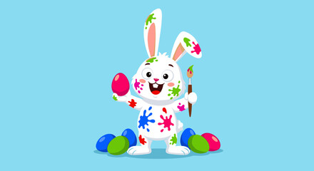 Joyful white easter bunny character covered in colorful paint splatters holding a pink egg and paintbrush for festive spring celebration.
